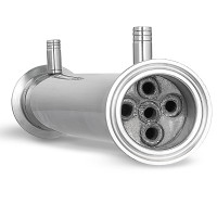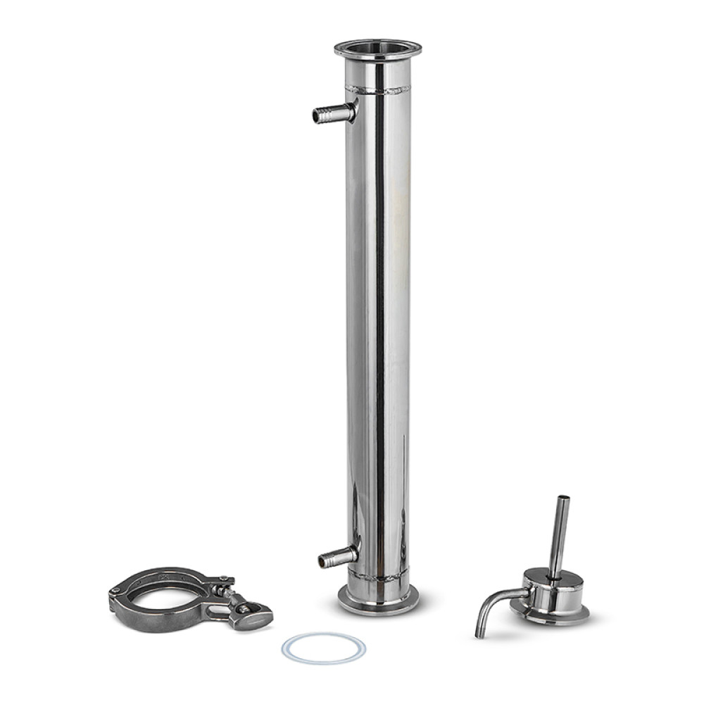 CheckoutThe boiler-type (film-type) type cooler is made of food grade stainless steel, which guarantees safety of use and durability. The structure is a hollow pipe with a flange for a clamp connection on one side, and a fitting for collecting the finished product on the other, between them are installed four tubes (boiler) with a diameter of 6 mm and a length of 300 mm each, the cavity around which is reliably insulated by two jumpers. Through the connected hose to supply cooling to the choke, cold water enters the tubes of the boiler, effectively cools the alcohol-containing vapor passing through them, resulting in a condensed alcohol solution.