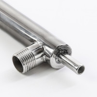 The Gorilych shell-and-tube aftercooler with an 10 mm fitting is made of food grade stainless steel, which guarantees safety of use and durability. The design is a hollow stainless pipe (casing) with a diameter of 25 mm, through which a stainless tube of a smaller diameter passes, ending at both ends with welded flanges with a diameter of 10 mm. Two unions with M20 thread are welded on the casing of the aftercooler for installing quick-detachable connectors on them (connectors are not included in the kit and are purchased separately) for supplying and discharging cooling water through hoses.
