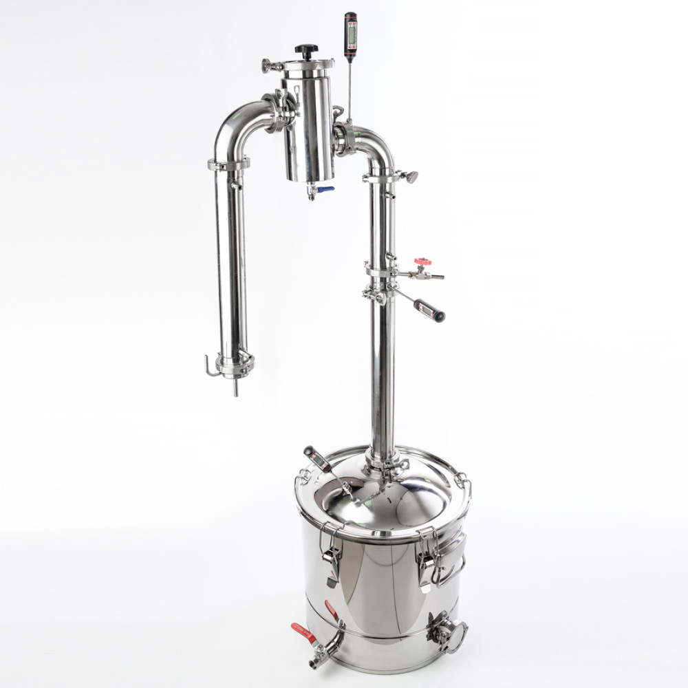 The set is able to cover the needs for any type of drink - vodka, moonshine, whiskey, cognac, liqueurs. The stainless steel gin basket makes it easy to flavor the finished drink using gin technology without placing herbs and berries in gauze bags. In addition, an internal groove is made on the distillation cube for a quick and easy installation of a false bottom to avoid burning thick fragrant bregs. There are technological units for collecting heads and draining the accumulated fusel oils in the gin basket without stopping the working cycle. The cube is equipped with a reliable thermometer, and an electronic thermometer in the column allows you to control the operating mode of the mash column.