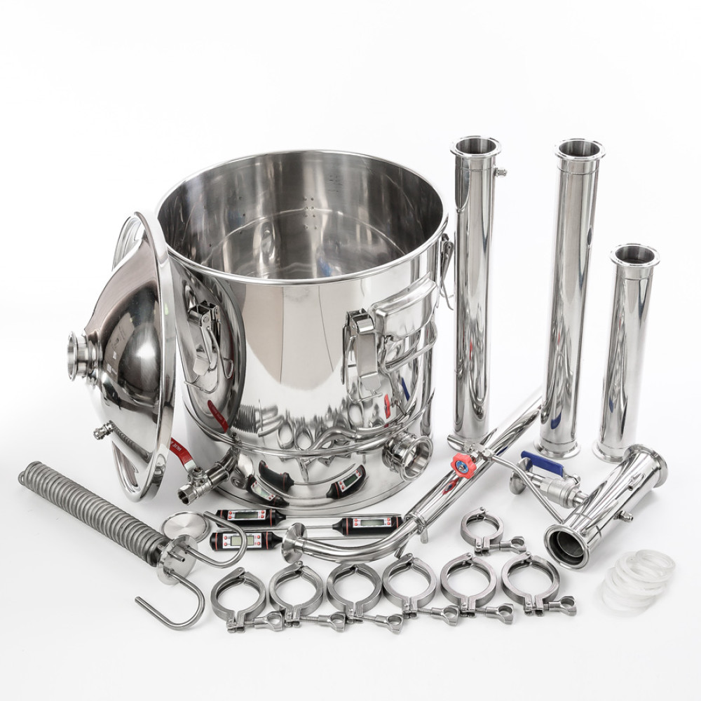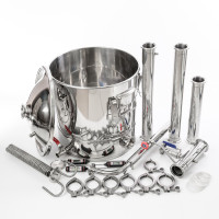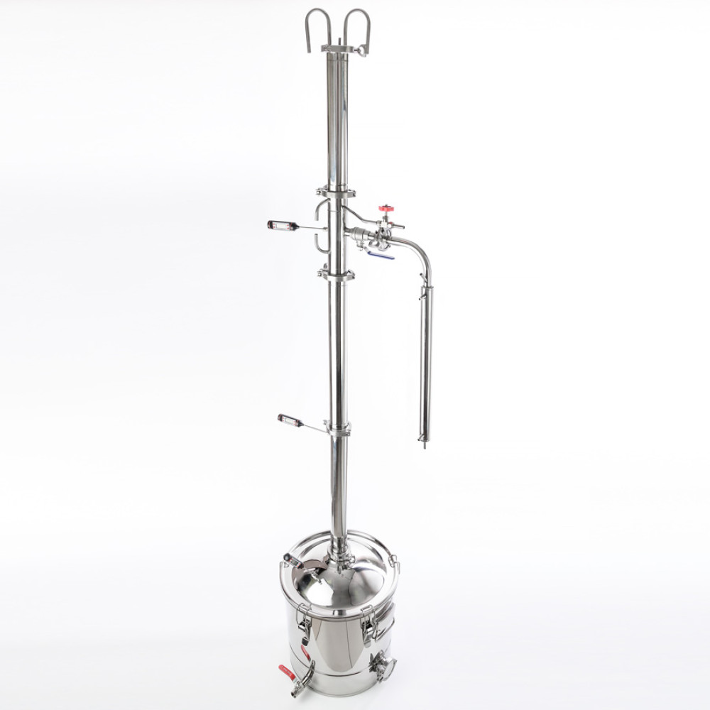 Another reason to buy a 2-inch distillation column with a 30/350/t dimrot under the heating element is a well-thought-out design of the apparatus, it is easy to work with it and maintenance takes several times less time than with outdated moonshine stills. All parts of the moonshine still dock with each other using quick-detachable clamp connections, so the time for preparing for the distillation of mash or raw alcohol is reduced several times. A wide mouth with a diameter of 350 mm provides easy access for cleaning the distillation cube, and an internal groove around the circumference allows you to install a false bottom with a diameter of 350 mm to prevent sticking of thick mash. The cube capacity of 30 liters is optimal for operation without the help of friends or relatives. Additionally, in the lower part, already in the initial configuration, a ball drain valve is installed for convenient and safe removal of the stillage remaining after distillation.
